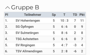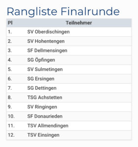 Am letzten Samstag belegten wir beim sehr gut besetzten Turnier der SG Ersingen mit 12 teilnehmenden Mannschaften einen hervorragenden 4. Platz. In zwei 6-er Gruppen wurden die Halb-Final-Paarungen ermittelt. Wir brauchten etwas bis wir im Turnier ankamen, drehten dann aber richtig auf. Nach zwei Auftaktniederlagen gewannen wir die restlichen drei Spiele und qualifizierten uns als Gruppenzweiter für das Halbfinale. In einem engen Spiel verloren wir leider gegen den späteren Turniersieger Oberdischingen ganz knapp im 9-Meterschiessen. Im kleinen Finale war dann die Luft raus und so beendeten wir das Turnier mit einem super 4. Platz. Top Team Leistung und Kompliment an alle Spieler die dazu beigetragen haben. Wir ließen den Abend mit den anderen Mannschaften im Ersinger Festzelt noch gemütlich ausklingen.